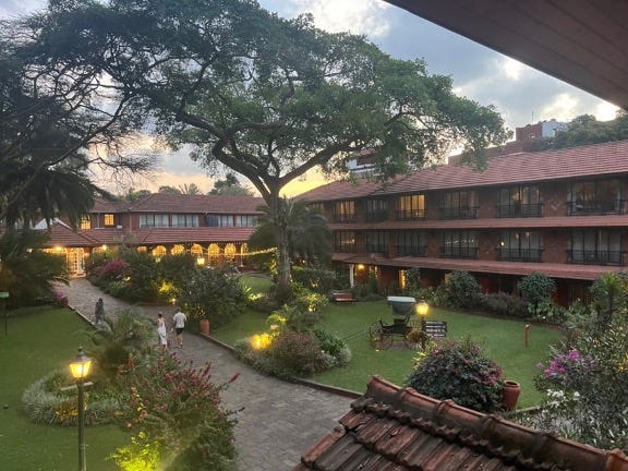 8:30am. In a bathrobe and slippers, dragging out my departure from a treatment room where the hotel has kindly allowed me to shower. The bastard guests aren’t checking out of their rooms very quickly, so I finally dress and set myself up with papers on the couches. (Note to self: bring swim suit next time.)