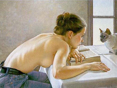 would love to see more non-sexualized nudity like this in art. this, right here? this is every woman: just at home relaxing with her tits out. she doesn’t have her tits out to please anybody but herself–she’s lounging around, she’s hanging out with her cat, she has her tits out just because. that’s a whole mood. that’s relatable, realistic, and very human. and it’s so superior to the massive amount of art we have of women frolicking around with their backs arched to appeal to the male gaze. lady just doesn’t wanna wear a bra. just wants to lounge around with a book and a cat and her tits just hanging. respect