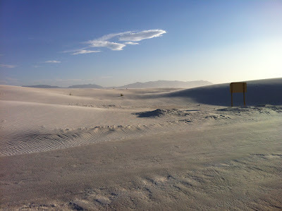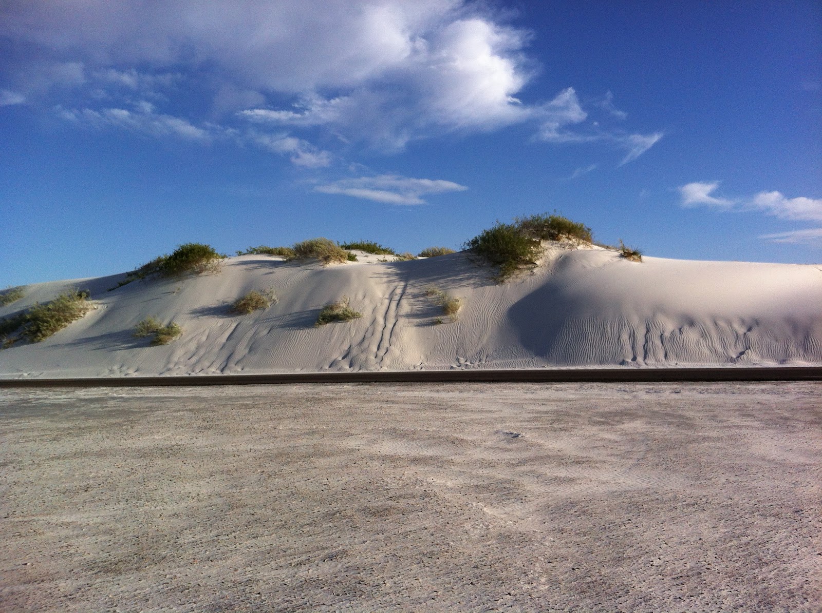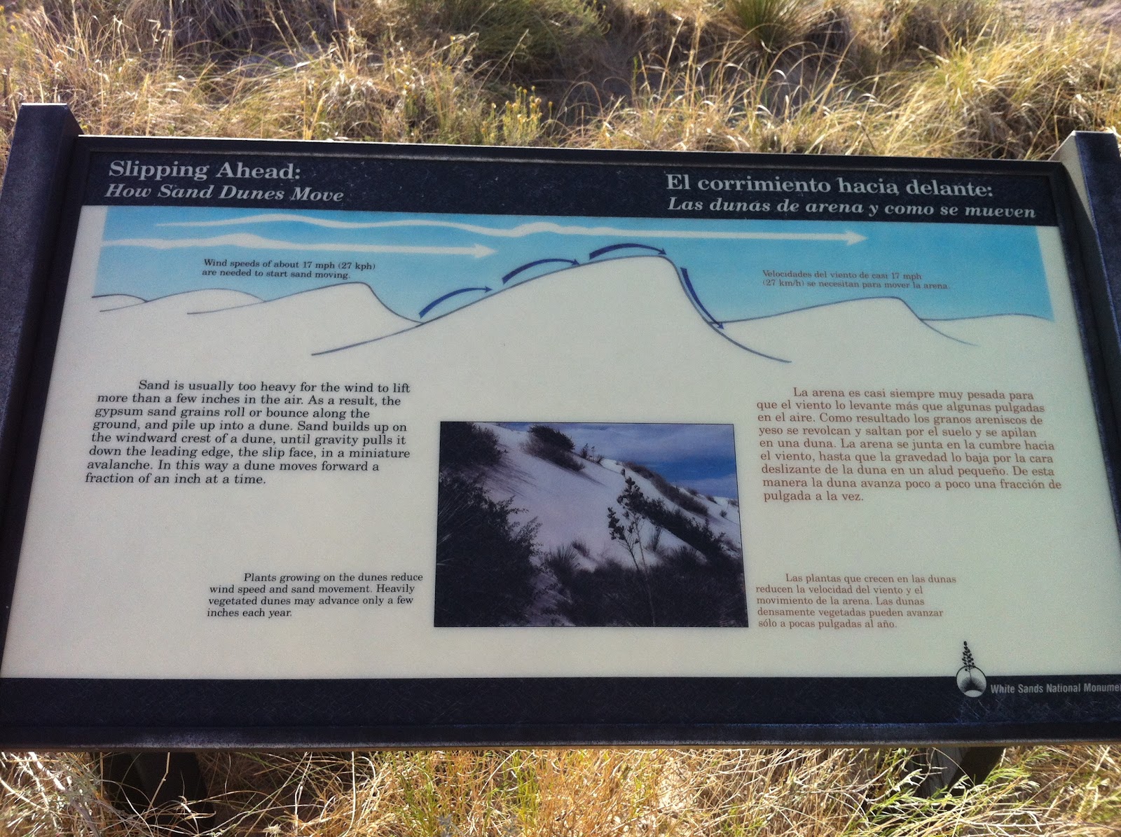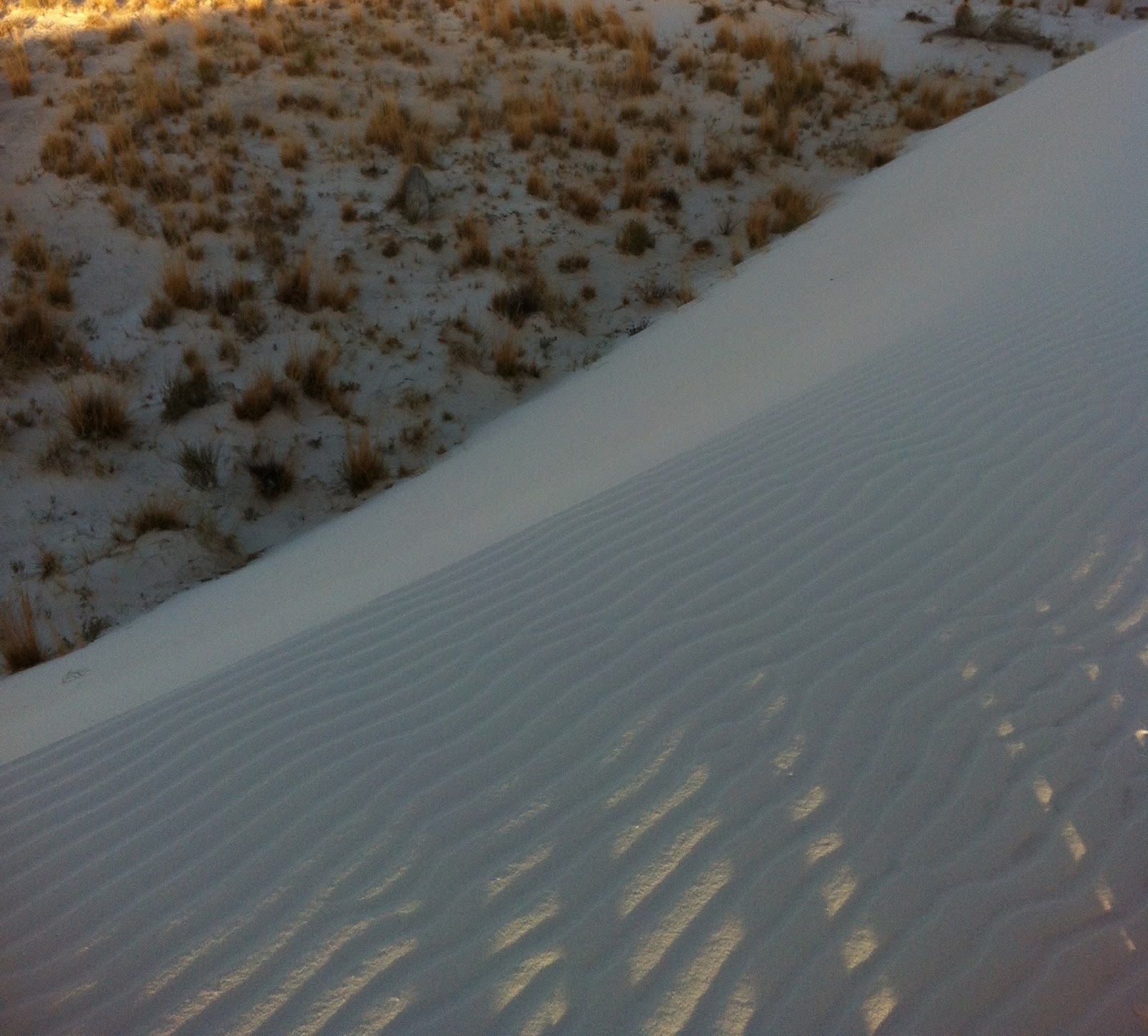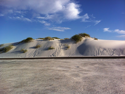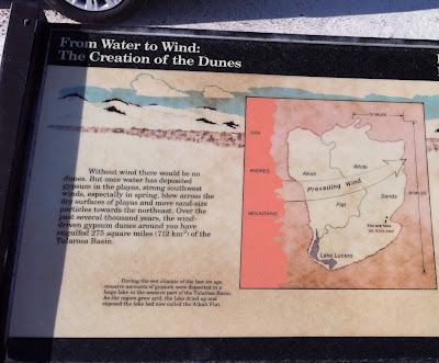 The Tipping PointThe wind lifts and rolls the individual grains up the windward side of the dune, until they collect at the crest. The gypsum sand grains build up into a sharp edge or overhang until gravity pulls them down the leeward face, moving the dune slowly forward, inch by inch. (Sometimes a helping boot may give it a little nudge, moving the dune forward just that small fraction faster).