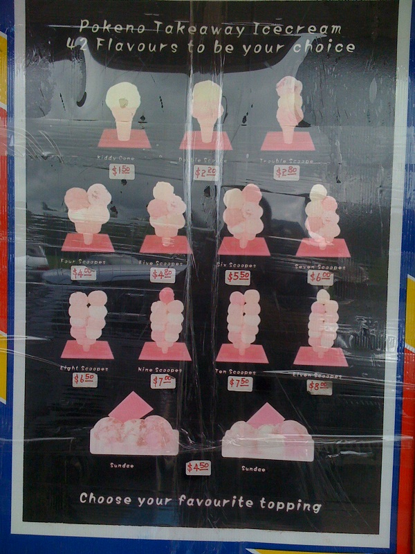 What made Pokeno famous - and still does today - is that they have the cheapest, largest scoops in the country. And 42 flavours to choose from! Not only that - you can have up to 11 scoops at once (on one double cone base) - for only $8. I am not kidding. It would be literally about a foot high at least, above the cone. I haven't tried it myself, as 2 scoops is plenty for me, but you can be sure my kids have been sizing it up as a worthy challenge.