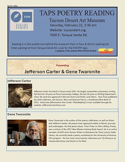 I will be sharing poems from my new collection Death at the Mall at the Tucson Desert Art Museum on Saturday, Feb. 22, at 3:30 pm.
