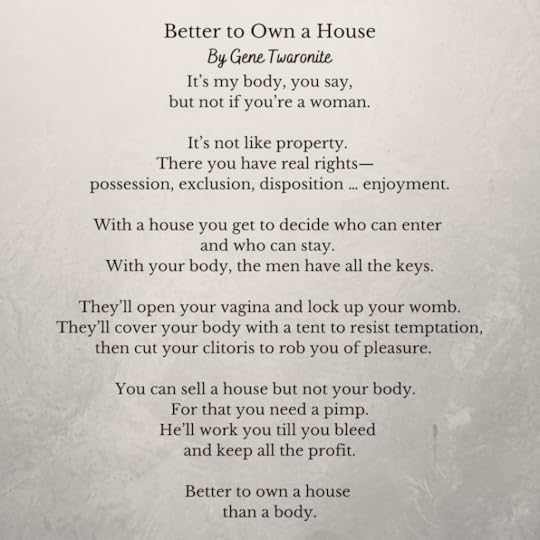 I was going over some older poems of mine for my reading tomorrow here in Tucson, and in light of today’s disturbing Supreme Court ruling I thought I’d post this poem. It cannot be said enough. Women’s reproductive rights are human rights. And none of us are truly free when women are forced to give birth.