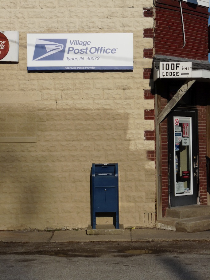Below is the "new" post office for Tyner, Indiana, where I went to three years of high school. The actual post office is the blue thing below the sign...