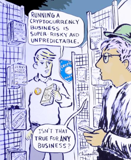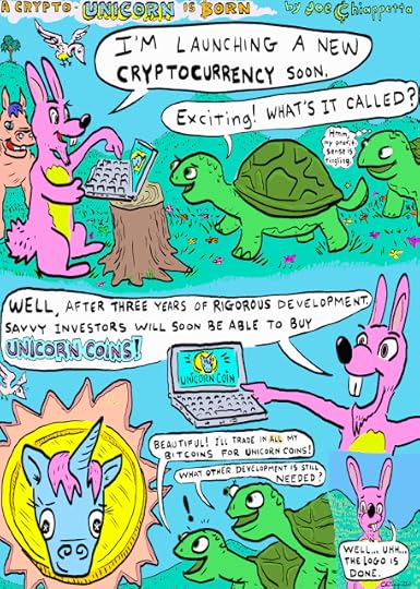 I drew this comic to poke fun at the riskiness of not just crypto-businesses, but any business venture. I drew this cartoon in black and white using an ink brush at the Ethereal Summit in New York City in summer 2018. Then I colored it on my touch-screen computer and am now issuing it as a limited edition piece of rare digital art. You can bid on and perhaps buy this crypto-collectible using Ethereum at the SuperRare marketplace: https://superrare.co/JoeChiappetta