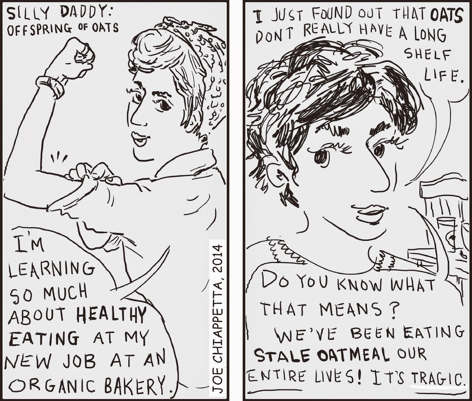 This Silly Daddy comic comes fresh out of the oven of life. While flexing her stone-ground organically grown muscles, my nutrition-minded daughter declared, "I'm learning so much about healthy eating at my new job at an organic bakery. I just found out that oats don't really have a long shelf life. Do you know what that means? We've been eating stale oatmeal our entire lives! It's tragic."