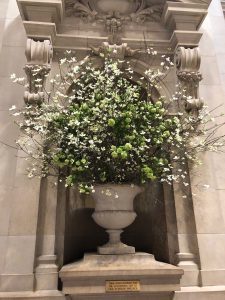 In the Great Hall of the Met, in five giant urns, towering twelve-foot-high flower arrangements change every Tuesday. These beautiful flowers add a lot of color and life to the museum.