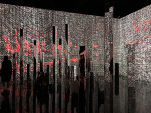 The rooms were full of people sitting on the floor, on cushions, or walking around. Each room had large silvered shapes which reflected the walls in an interesting way.