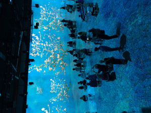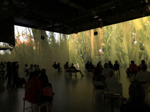 I walked into three huge interconnected rooms which displayed the same giant moving images of Van Gogh's work, repeated; images were projected onto the floor as well. The ceilings remained dark, but visible and unadorned (which did detract from the immersiveness of the experience).