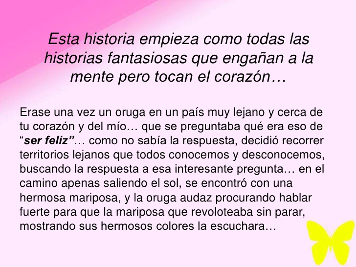 En un día soleado volaba cerca una bella mariposa .Desde su vuelo, pudo contemplar a la solitaria oruga y decidió acercarse a saludarle. En cambio, la amargura de la oruga se notó en su respuesta. La oruga no entendía porque todos los insectos se preocupaban tanto por ella, eran tan negativa en sus ideas mentales que no veía más allá de las mismas. La bella mariposa ya había experimentado su transformación y por eso deslumbraba felicidad, alegría y gozo, regalándole palabras de aliento, algo que la oruga que estaba en su proceso de metamorfosis, aún no le hallaba ningún sentido. y lo que es peor se molestó por completo con los consejos de la bella. Deseaba estar en paz y soledad absoluta. Se sentía enfadada con el mundo y consigo misma. Era tan grande su victimismo que respondió a la bella mariposa que podría morir del coraje que le ocasionara las palabras de la mariposa.Inconscientemente, bella le enseño la paciencia, ya que provenía una gran transformación dentro de su ser, le sonrió y le dijo que no se resistiera al cambio, diciéndole nos vemos al otro lado de la libertad. Ay! Vaya enojo que sintió la oruga, aislándose por completo en su "ataúd", en su burbuja protectora.