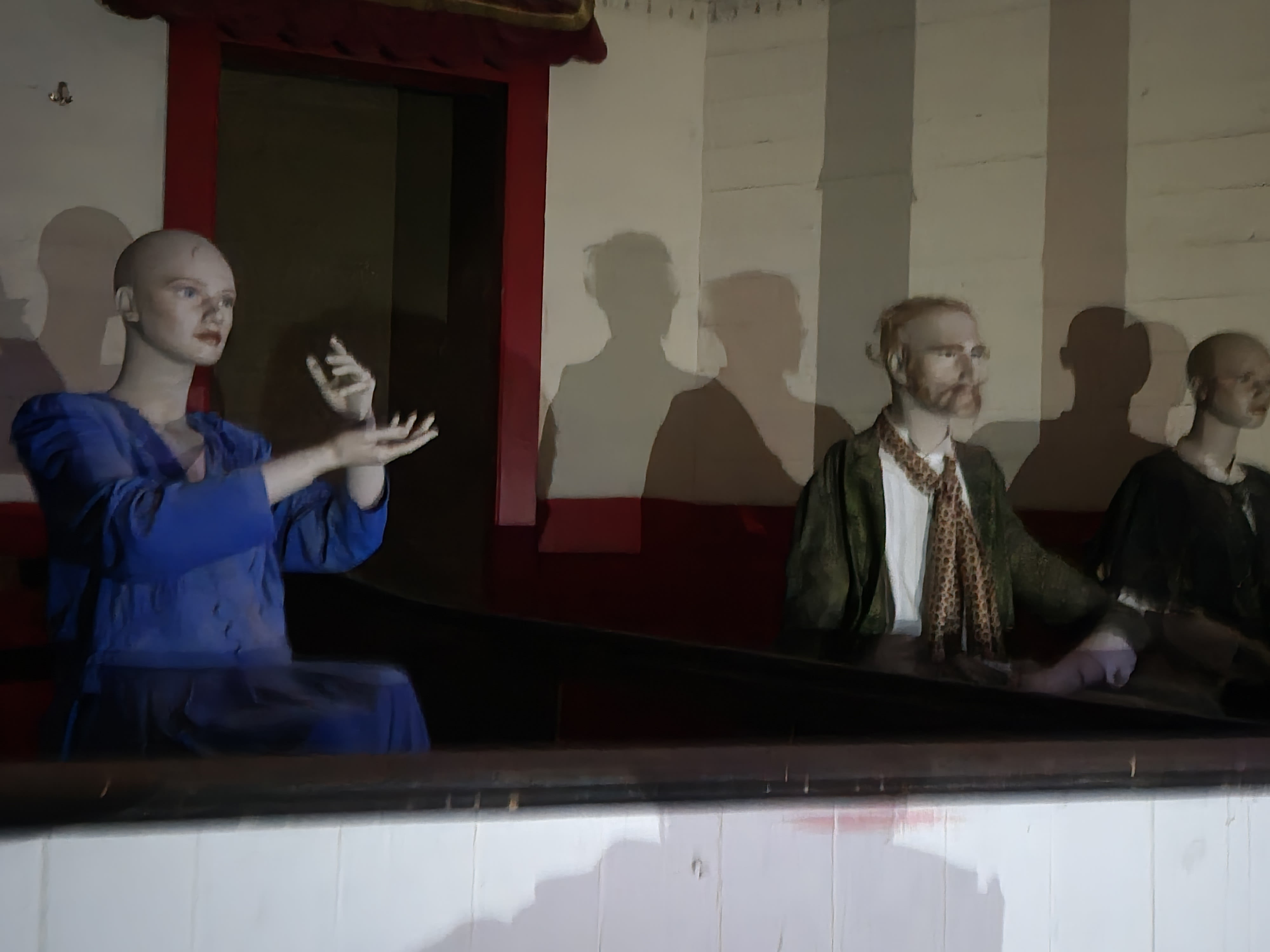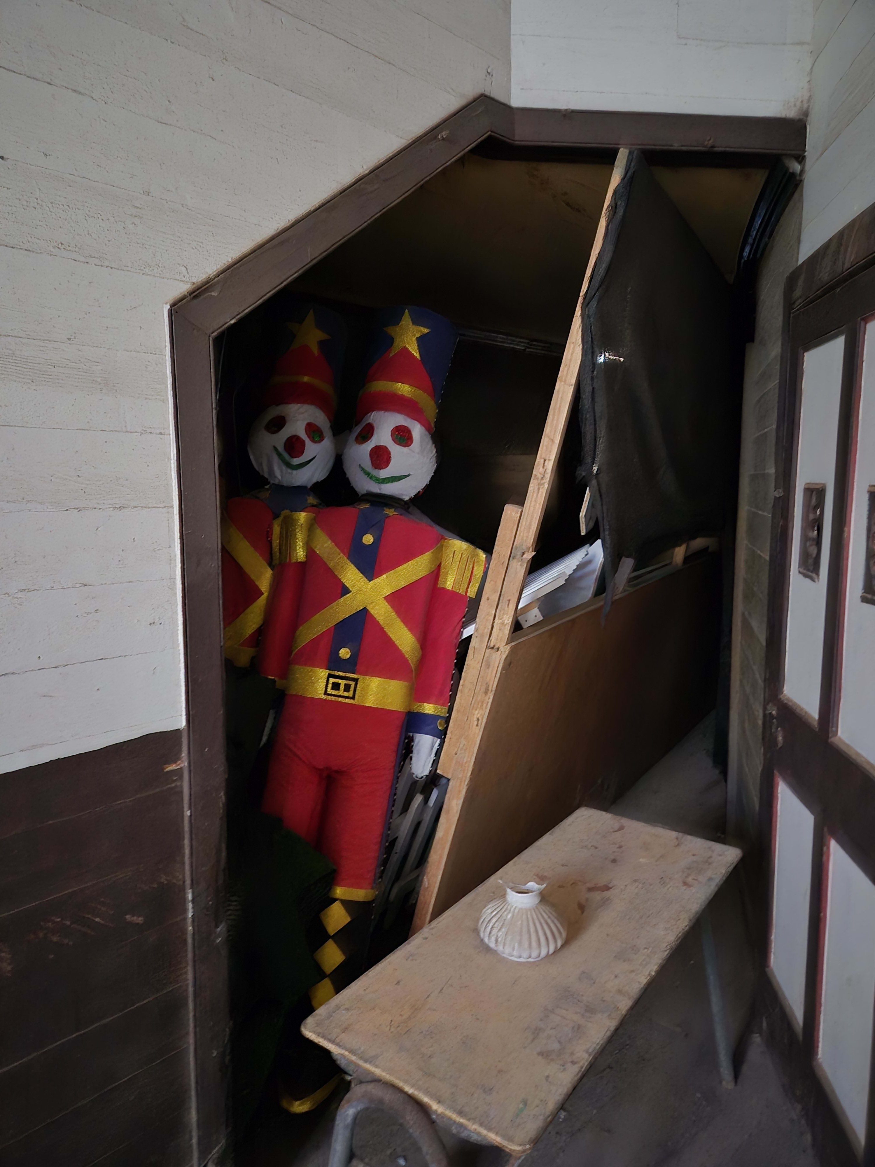 Someone had stolen their wigs, and they sat frozen in the gloom, like ghastly apparitions from a film that Adam Curtis might have made. As I turned to leave the theatre, I passed another mannequin of a grinning clown-soldier, that had fallen out of a cupboard.