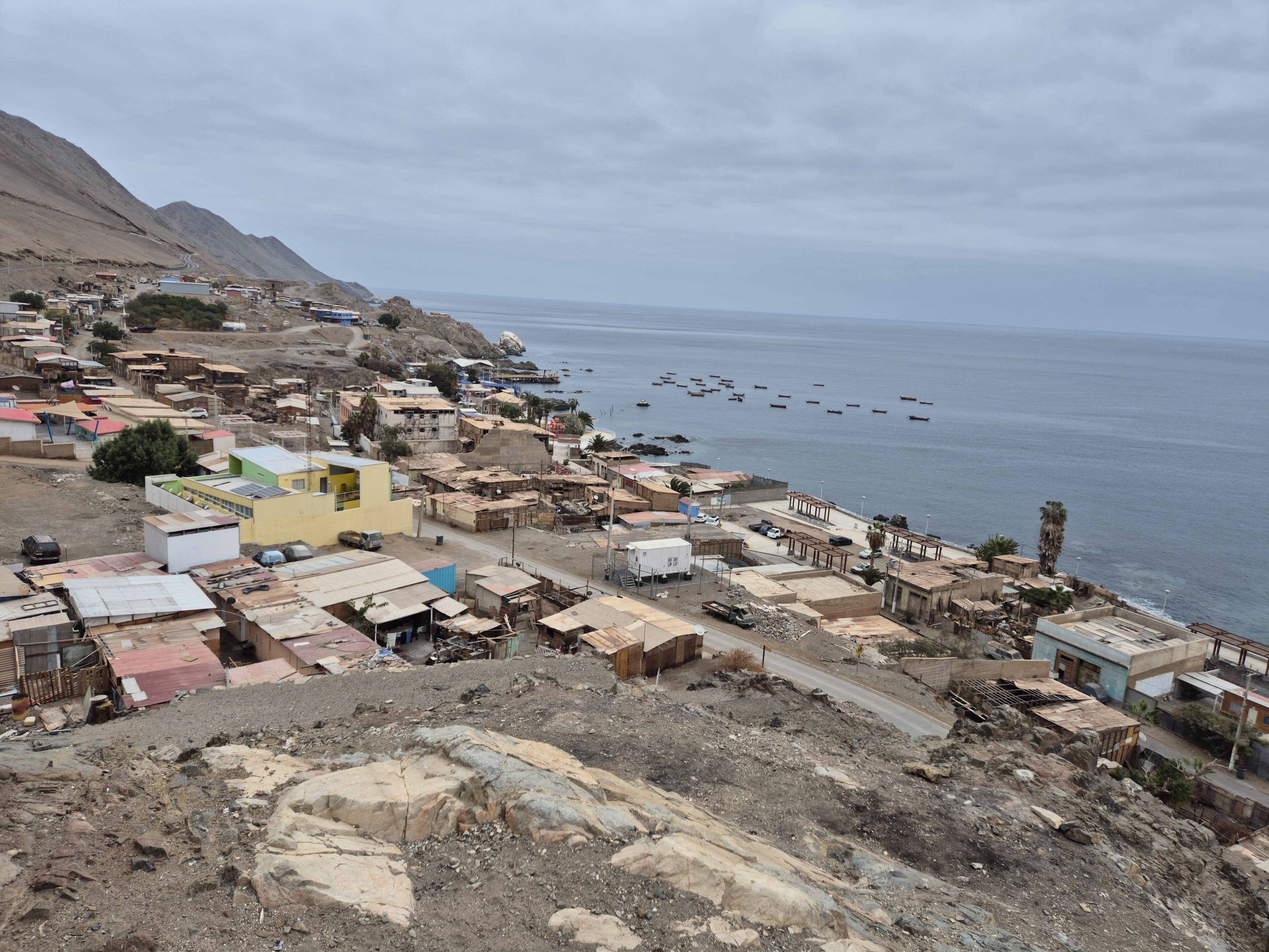 After about twenty minutes, Pisagua appeared below us, flanked by looming cliffs that enhanced its gloomy end-of-the-world isolation.