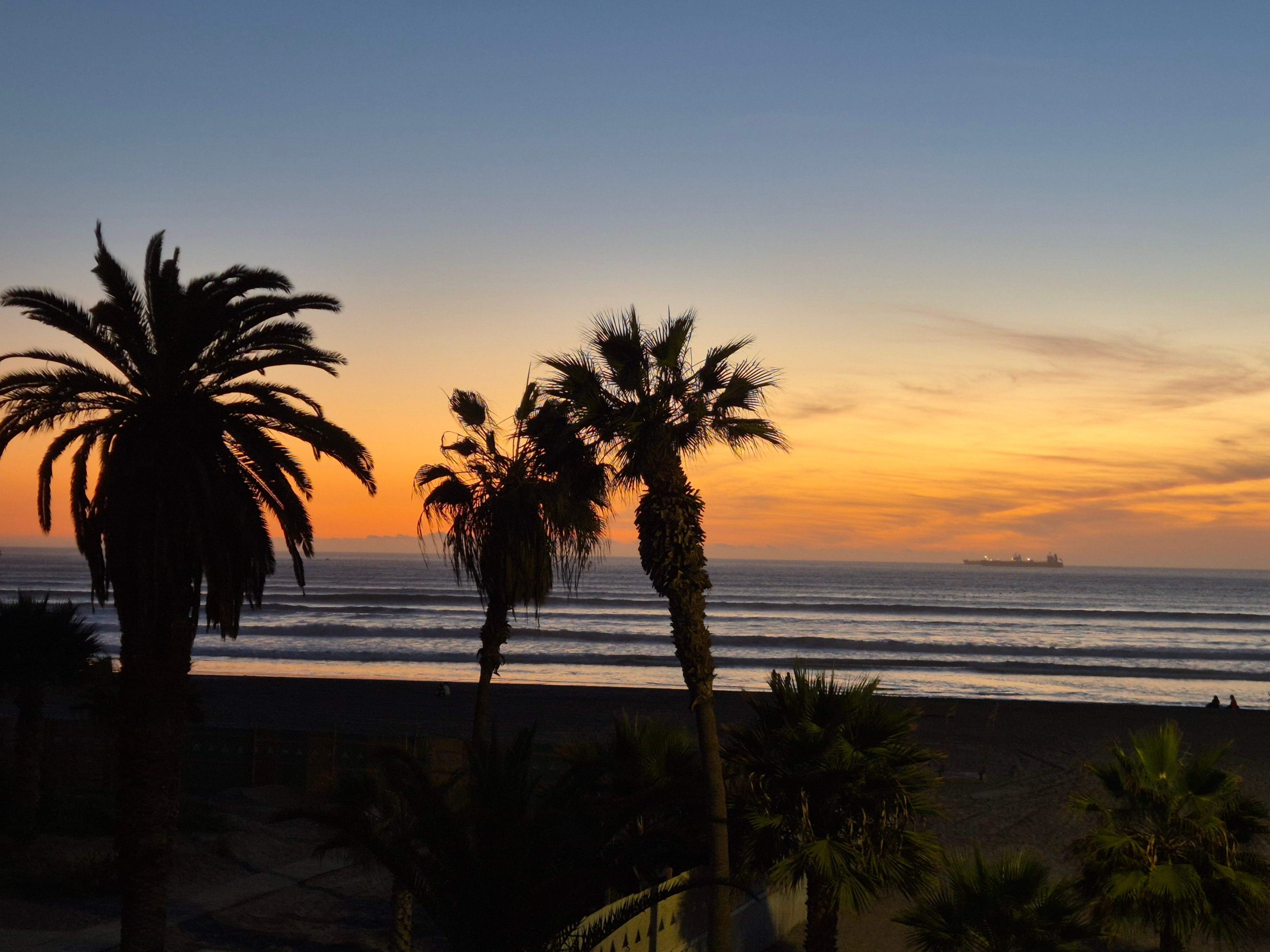 That night we could see the Pacific from our hotel window, eleven floors up, but all we could hear was the thumping of music from a nightclub down below, that required ear plugs to ensure sleep. The next morning we woke up from ragged disco dreams and gazed down upon our desert home. On the beach to our right, young men and women played volleyball amongst the palm trees, while the ocean crashed against the sand, the big waves still a dull mackerel-grey in the sunless sky. Immediately below us, a little promenade with palm trees that exuded theme park tackiness gave way to the highway leading towards the Morro - a rugged slab of rock looming over the harbour with the Chilean flag flapping wildly in the wind.