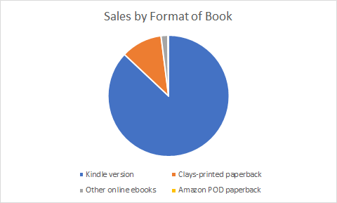 My paperback sales through my Clays/Gardners distribution account for about 12% of total numbers; they have been sold by Amazon UK, a few on Amazon.com (USA), Waterstones, The Book Depository and some good folk who have bought the book through their local independent bookshops. I do wish that number was higher.
