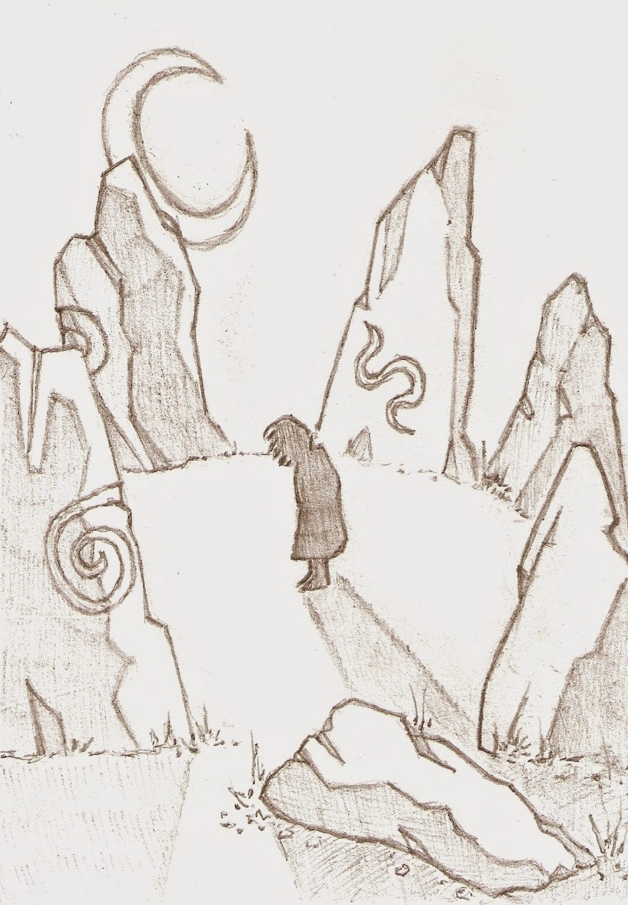A creepy child and creepy standing stones.But I was always determined that I would. In fact, looking back, that it was one of the many reasons I was so desperate to get to this point of writing full time: with writing a job rather than a sideline I could go back to being able to have actual hobbies, I could pick up art where I'd left off, and maybe in the long term I could see what might have been.Only when the time came it was kind of scary ... because what if I'd lost whatever bit of talent I'd had? I literally hadn't done more than doodle in ten years, and though people would occasionally point out that those doodles were quite nice, my own feeling was that I was struggling to draw a straight line, let alone anything that actually looked like anything. Obviously then, the logical thing to do was to start with something really difficult. Like a turtle, say. Like the one up in the top right. But, while it took me about two whole months, it did work out better than I'd dared hope. And since then I've had a picture on the go pretty much constantly; it's staying as a hobby because, hey, that was pretty much the whole point, but it's been one I'm getting an awful lot out of.
