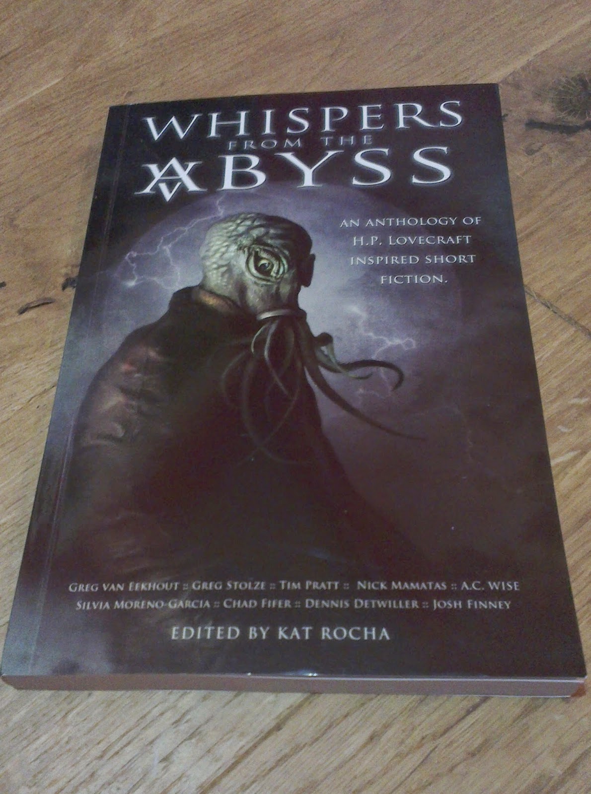 One of the nice things about being a writer is that every so often, out of the blue, people send you exciting things in the post. And statistically I suppose that the longer you go at it, the more of a chance there is that those things are going to arrive on your birthday. Still, it was a nice surprise when not one but two parcels containing contributor copies arrived just in time for me to pretend that they'd been sent to celebrate my successfully surviving another year.I've already talked plenty about 01 Publishing's anthology of Lovecraftian Horror Whispers From the Abyss - and rightly so, it's really good - but I tell you, however good it was as an e-book, it's a whole lot better in print. And this isn't just my weird, old-man affection for books that are made out of dead trees talking, either; in fact, it's got a lot more to do with my weird, old-man affection for additional artwork and sexy formatting and books that are generally really nicely put together. Honestly, I wish I could show you how great this thing looks on the inside ... and I could, quite easily. But it would involve taking more photographs, or scanning or something, and honestly, I'm bored with both of those things right now. You'll just have to take my word for it.