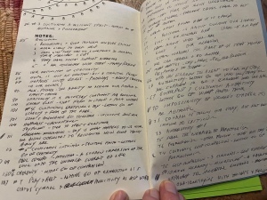 I read novels and historical books on my iPhone. My other reading is of books with spines and covers and words on cream-colored pages. Those are the books on which I take notes, copious amounts of notes, starting on the back inside cover and working my way inward. If it’s a really good book, I run out of blank pages in the back and switch to the semi-blank pages at the front. I put the page number on the left side, and then a quote. If you turn to the page, the quote is underlined or in brackets. If it’s really good, it’s starred in both the back of the book and on the page itself. Some books have hardly an unmarked page. Swamplands of the Soul, by James Hollis, is covered with notes and underlined passages from front to back. It is one of my favorite books of all time, even better than The Middle Passage, another great book by the brilliant Jungian analyst.