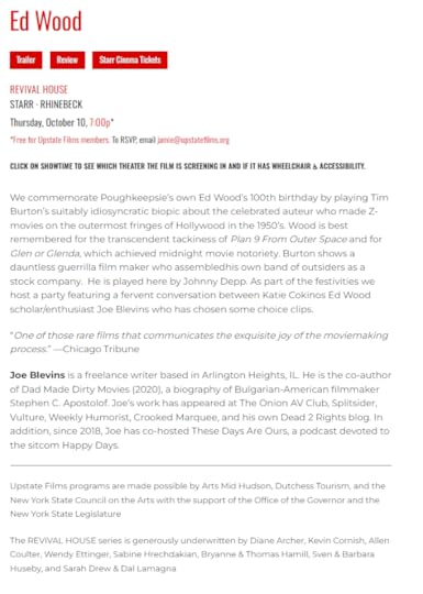 On the very rare occasions when I am asked to be a podcast guest or interview subject, I try to gauge whether the host is okay with talking about the more sordid aspects of Ed Wood's life and career. If not, I know to stick to the relatively benign 1950s stuff: angora sweaters, UFOs on strings, plywood cemeteries, etc. From my discussions with Katie, I knew this was going to be one of those "keep it light and fun" kind of interviews. I explained that it would not be possible for me to travel to Rhinebeck to attend the screening in person, but I would be happy to make my presentation via Zoom. This was amenable to Upstate Films, and arrangements were soon made. Before it vanishes forever from the internet, here is a listing for the event, including my self-penned introduction.