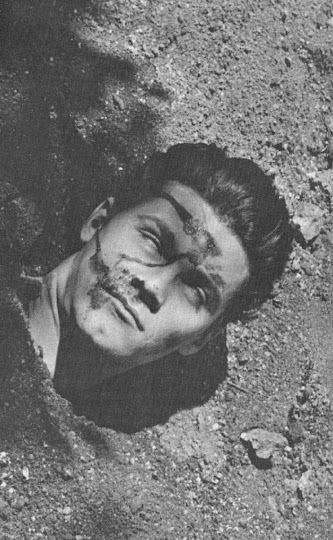 As the story progresses, we get some photographs of the girls carrying the peeper's body around. He does not look dead so much as dazed. His eyes are wide open in some shots and closed in others. The photographer has bothered to slather some stage blood on the man's face and chest. How this is supposed to arouse the reader, I have no idea. Eventually, they throw him into a pit and bury him up to his neck. This basically aligns with Ed Wood's text, as does the peeper's unexpected revival. Once again, the girls look more amused than horrified. They all seem to be having fun on a nice, sunny afternoon.