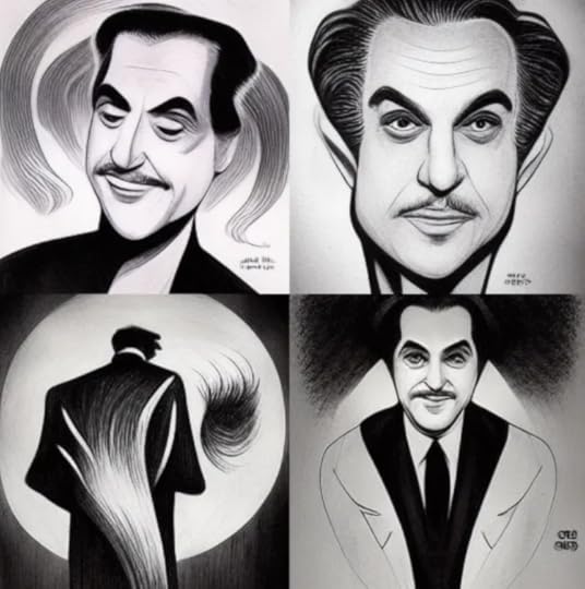 I chose a service called Midjourney to do this. Why? Because I'd seen it in this video by a YouTuber called Mighty Jabba and thought the results looked cool. Very quickly, though, I realized I was in over my head. I don't know a damn thing about how to generate AI art. My first prompt was: "Ed Wood as drawn by Al Hirschfeld." (I assume you know who Al was.) Here were the results: