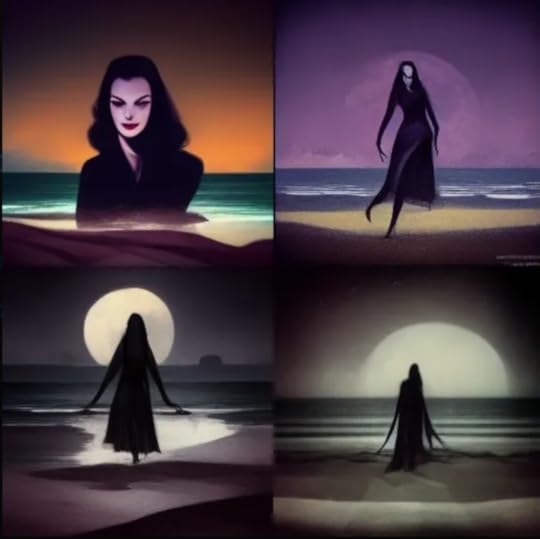 I don't know what's happening with the top left image, but the other three are at least in the ballpark. I then went on to Wood's repertory players. Folks, I tried and tried to get Midjourney to generate some Tor Johnson fan art, but that stupid computer had no idea who Tor was. None of the artwork even came close. So I ditched Tor in favor of Vampira. More specifically, I tried "Vampira on the beach at night." Even Midjourney knew who Vampira was, and it dutifully belched up these lovely images: