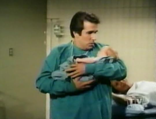 The Season 9 episode "Little Baby Cunningham" is a perfect example. The plot has Lori Beth (Lynda Goodfriend), wife of Fonzie's best friend Richie Cunningham (Ron Howard), giving birth to her first child. Since Richie is stationed in Greenland with the Army, however, Fonzie takes Richie's place, both in natural childbirth classes and in the delivery room. When Richie, Jr. is born, Fonzie is even the first to hold him! Through all these events, Fonzie carries on melodramatically, stealing focus from Lori Beth, who should be at the center of this story.