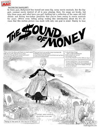 MAD tackled this very phenomenon when they parodied The Sound of Music as "The $ound of Money" in 1967 with art by Mort Drucker and a script by Stan Hart. That marvelous satire includes spoofs of many of the songs from the film, including "How Do You Solve a Problem Like Maria?" MAD's version was called "How Do You Solve the Problem of Religion?" and it went (in part) like this: