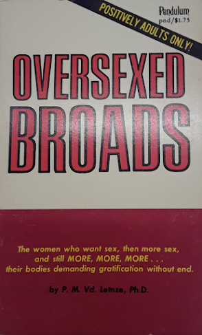 One thing that briefly flummoxed me about this article is that Ed Wood repeatedly cites a book called The Gay Girls that he attributes to someone named "P.M. Vd. Leinze, Ph.D." I couldn't find any author, pornographic or otherwise, named Leinze and thought Ed must be making this up. But, no, the last name is just slightly misspelled. It's actually P.M. Vd. Letnze, Ph.D. This Letnze person is the author of such adult paperbacks as The Cherry Pickers (Impact Library, 1967), The Ultimate Orgasm (Impact Library, 1968), Oversexed Broads (Pendulum, 1968), and, yes, The Gay Girls (Erika Press, 1970). That last one is subtitled Scalding Case Histories of the Fiery Passions That Roil.
