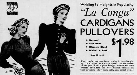 The popularity of these actresses and other sweater-wearers caused young women everywhere to rush to the nearest department store and imitate the style themselves. Back then, sweaters were available in "all the colors and the styles." Eddie has particular nostalgia for a type of sweater he calls "La Conga." I checked some old newspapers from the 1940s, and sure enough, there were a few ads for these items. Here's one from the November 1, 1940 edition of The St. Louis Star and Times.