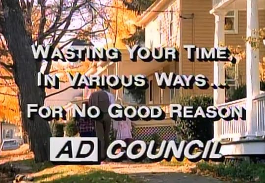 Specifically, the Ed Wood article "When Then the Topic is Sex" reminded me of an ad parody that SNL first aired on December 7, 1985. The sketch starts with a sharply-dressed announcer (Rex Robbins) walking past a power plant and talking about America's energy consumption. But then it cuts to a ranch, where the same announcer (who has ditched his suit in favor of denim work clothes) is now talking about cowboys. Another cut, and now he's walking through a field and discussing "pollen and other irritants." Yet another cut, and he's on Wall Street (back in his suit) and telling us we need "sound financial security." One final cut, and he's ambling down a sunny suburban street and drinking a can of soda he declares to be "cracklin' good." Finally, we arrive at the tagline: "The Ad Council: Wasting your time in various ways... for no good reason."