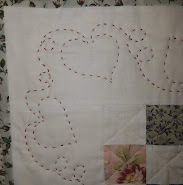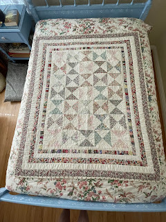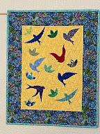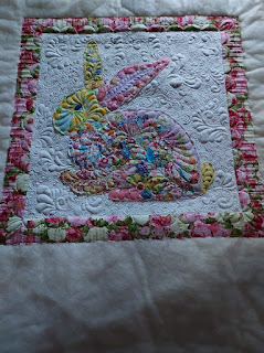 When I began learning to quilt, I didn't have a sewing machine. I made that first quilt for my nephew by cutting out all the pieces with scissors, sewing the pieces together with a single needle and thread, and quilting it by hand. My nephew was six months old before I finished it and I worked on it every day. I point out how I made every aspect by hand because these days, most people sew their quilts entirely by machine. I too sew the top on my machine, which makes it go oh so much faster. When it comes to the quilting though, I often opt to quilt it by hand because.......you guessed it, the act of hand quilting brings me joy and a great sense of satisfaction. In some strange way, it connects me to quilters of long ago, who didn't have lovely sewing machines to do the quilting for them. Once in a while though I will hire a "longarmer" to quilt a piece that requires a more sophisticated touch, like the bunny. I could not have done the bunny justice by hand, but a wonderfully talented woman named Louise Klare could, and she did. I smile every time I look at bunny who now hangs in my sewing room.