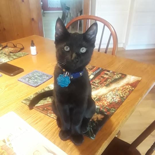 I stood there a little stunned, then phoned my husband. He wasn’t too excited about the prospect of bringing an unknown kitten into our home. We did agree that the dog had been grieving and lonely since our cat passed away. We’d been hesitating to look for another. Nevertheless, we phoned the judge later that evening, and as promised, he met us at his office. We walked into the break room and there was the tiniest little black kitten I’d ever seen scurrying all around the room like little flashes of black lightning. In one corner was the lid of a computer paper box filled with litter, and in another corner was a plate of tuna and a bowl of water. We no sooner sat at the table than the kitten ran up my husband’s pant leg, laid in his lap, and began purring with a rumble that sounded like one of the trains roaring through the middle of town. He stared up at my husband with piercing, iridescent, green eyes.