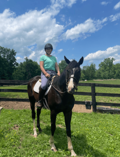 I was planning a trip to Kentucky to get a horse, when my friend Caitlin sent me a message, “Hey there’s the horse my MIL has. He’s really nice. I wanted to get him but I can’t right now. You should go check him out.” The next morning I was on the backside of Charles Town Racetrack watching a leggy black 4-year-old gallop around the track. He was calm and kind with a gentle eye, not to mention heart-meltingly handsome. I cut a check and we put him on the trailer.