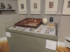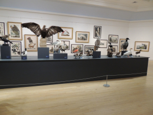 Naturalists like Audubon shot and stuffed birds as a way to study them before most photography was available. Still, those birds made to look alive with arsenic and other chemicals have usually depressed me when I’ve seen them in museums and nature centers, though I understand it’s about heritage: the question being like what to do with a fur coat some inherit? Maybe it was the choice to take some of the stuffed birds, (which were were part of the museum’s earliest collection, about a hundred years old), out of glass cases, set between the engravings and under bright light, that let me see them more as something once alive, vibrant with second chances. They were surrounded by displays such as a small shelter with stuffed owls perched high, and where we were invited to listen for a recorded mouse noise, and test our hearing against the mightiness of an owl’s. I admired the craft supplies laid out so people could try to make a nest as gorgeous as that of a bower bird’s, and big chalkboards where children could measure the span of their arms against wings of various birds. Short videos showed masses of birds in fight, charting swarming patterns through sky. This wonderful exhibit will be up until June 17.