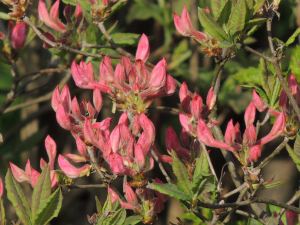 After we left, Peter and I drove to Pittsfield State Forest to picnic. A woman with a golden retriever we admired told us of the five mile loop up the mountain where we saw the state’s highest body of water, an amazing view of the Berkshires, and lots of what the park calls azaleas, and what I called honeysuckle as a girl, and what internet sources tell me can be called honeysuckle or native azalea. A lot of pink under a blue sky. Birds called.
