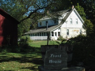 A few days ago my husband and I visited one of the three Robert Frost homes http://www.frostfriends.org open to the public, this one just north of Bennington, Vermont, where the poet is buried. Here's a view of the house though I couldn't fit in the birches, which of all the trees Frost wrote about I think he treated the most tenderly. He said, "I never go down the shoreline to New York without watching the birch trees to see if they live up to what I say about them in my poems."