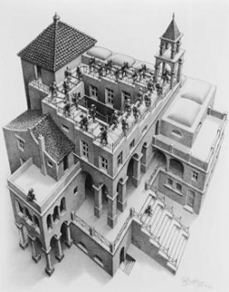 Peter and I recently visited The New Britain Museum of American Art http://www.nbmaa.org/ a treasure not far west of Hartford, Connecticut. Special exhibits included one of Hudson River paintings, illustrations for pulp novels, and the one we especially came for: M.C. Escher: Impossible Reality, showing through November 14. We enjoyed the sketches Maurits Cornelis Escher (1898-1972) worked out on graph paper, and the range of his woodcuts, lithographs, and other prints. Apparently his brother was a geologist, who got him thinking about the symmetry found in crystallized forms. M.C. Escher said he found he usually had more in common with mathematicians than artists. Here is Ascending and Descending: