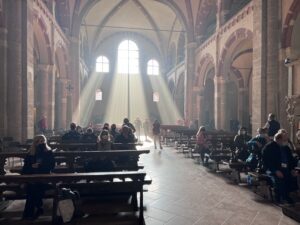 We were there to greet them and the deplaning process was simple. We boarded our bus for the hour drive to downtown Milan. Along the way we opened the pilgrimage with prayer, all got acquainted, and prepared everyone for the delights that await them!