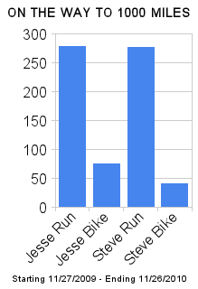 Then on November 27, 2010 my son Jesse and I decided to run 1,000 miles in one year — and to ride our bikes 1,000 miles in a year. You can follow our progress with the chart to the right which is updated daily.