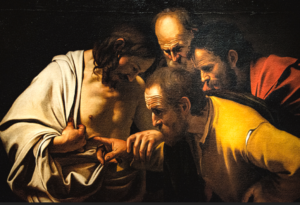 John 20:26–29: Jesus came, although the doors were locked, and stood in their midst and said, “Peace be with you.” Then he said to Thomas, “Put your finger here and see my hands, and bring your hand and put it into my side, and do not be unbelieving, but believe.” Thomas answered and said to him, “My Lord and my God!” Jesus said to him, “Have you come to believe because you have seen me? Blessed are those who have not seen and have believed.”
