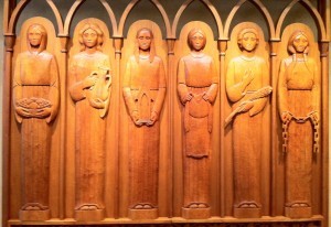 The six items held by the women representing the virtues or acts of mercy are taken straight from the Gospels – from Matthew 25:34-36 and are the basis for judging whether people are going to heaven or hell.