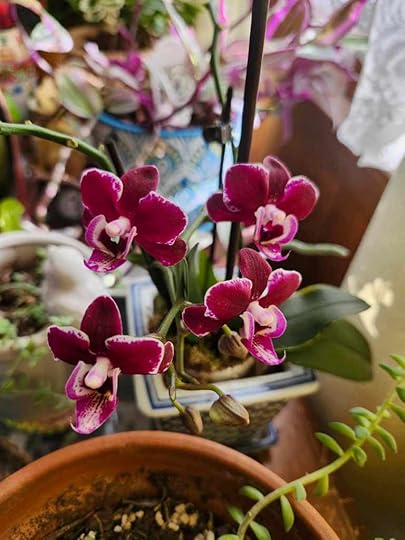 My orchid rebloomed. I have never managed to get an orchid to rebloom! This one was a surprise gift from Christopher, and it arrived in gorgeous bloom. I was delighted and added it to my collection of indoor plants happily, but I fully expected that I’d be tending it for the green leaves alone after those blossoms fell. It surprised me with holiday flowers.
