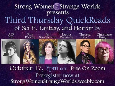 Strong Women - Strange Worlds presents Third Thursday Quick Reads of Sci Fi, Fantasy, and Horror by A.D. Sui, Kim Poovey, Jan Stinchcomb, Larina Warnock, Theresa Tyree, and yours truly, Christiane Knight. Happening October 17th, 7pm EDT, Free on Zoom!