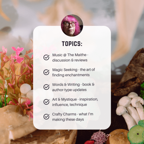 Magic All Around brings all the pieces of me – DJ and music lover, artist, and writer – together in a podcast. Episodes will feature discussions about where I find inspiration in music, art, crafting, and writing, and how all those aspects blend together to convey the mystery of what I call Magic Seeking. I’ll also be talking about updates and giving excerpts from what I’m writing and working on, as well as news about other writers, artists, and musicians – especially indies – all in a casual and fun style! I focus on hopepunk, classic & contemporary SFF, post-punk, fae and mythology, & more.