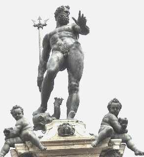 La fontana del Nettuno a Bologna presenta questa famosa statua voluta da papa Pio IV dei Medici, (niente a che vedere con i Medici di Firenze, ma di origine lombarda), fu promossa dal cardinale legato di Bologna Carlo Borromeo, gestita dal vice legato Pier Donato Cesi. Progettata dall’architetto e pittore Tommaso Laureti nel 1563, venne sormontata dalla imponente statua in bronzo del dio Nettuno dello scultore fiammingo manierista Jean de Boulogne da Douai, detto il Gianbologna. La statua è alta tre metri e venti e pesa 22 quintali. Si racconta che il Gianbologna volesse realizzare il Nettuno con i genitali più grandi, ma la chiesa glielo proibì. Lo scultore però non si arrese, infatti disegnò la statua in modo tale che da una particolare angolazione (vedi foto sopra) il pollice della mano sinistra tesa del Nettuno sembra spuntare direttamente dal basso ventre. All’epoca le donne della città, alla vista della statua, si turbavano, così che la chiesa dovette mettere dei pantaloni di bronzo al dio del mare. Tutta la fontana ha comunque una forte valenza erotica: le ninfe di contorno spruzzano acqua dai seni.