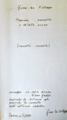 Così ebbi modo di scrivere anni fa quando pubblicai una piccola antologia di suoi scritti sotto il titolo di "Alle Falde del Monte Saro. Il libro di Gino". Oggi, che in questa antica e "nobile" città di Sarno, che vede pubblicare libri su libri, scritti da chi se li scrive e se li legge perchè se lo può permettere, i "quadernoni" scritti a mano di un vecchio e malinconico poeta, quasi centenario, rimangono chiusi e segreti agli uomini e al tempo. Un invito a chi può, a raccogliere questi fogli e far vivere questi pensieri regalandoli al futuro.