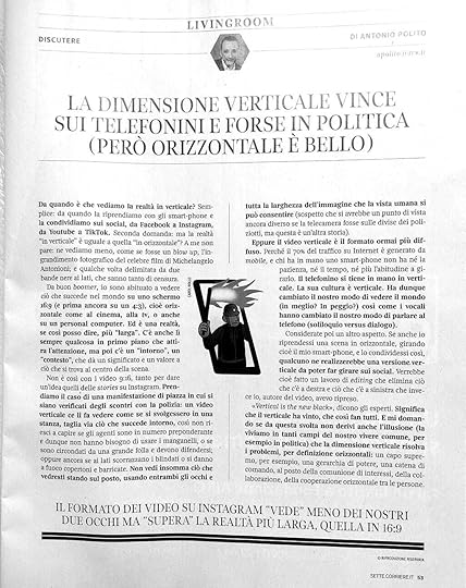 Nella foto dell’articolo che ho in proposto in apertura, lo scrittore e giornalista Antonio Polito, in un acuto ed interessante articolo presentato nel suo “livingroom” settimanale, sembra ribaltare la situazione. Ridiscute, a suo modo, il modo di vedere la realtà attraverso la lente dei social. Quando io sostenevo, e ancora credo a quello dicevo ai miei studenti, che l’analisi verticale segue quella orizzontale, il cartaceo è conoscenza verticale, l’orizzontale, il digitale, sta per informazione, Polito scrive che la realtà è invece in verticale da quando la riprendiamo con gli smartphone e la condividiamo sui social.