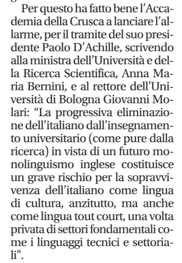 “La progressiva eliminazione dell’italiano dall’insegnamento universitario (come pure dalla ricerca) in vista di un futuro monolinguismo inglese costituisce, come ha osservato anche la European Federation of National Institutions for Language, un grave rischio per la sopravvivenza dell’italiano come lingua di cultura, anzitutto, ma anche come lingua tout court, una volta privata di settori fondamentali come i linguaggi tecnici e settoriali”. E’ l’allarmata preoccupazione che l’Accademia della Crusca, tramite il suo presidente Paolo D’Achille, professore ordinario di Linguistica Italiana al Dipartimento di Studi Umanistici dell’Università di Roma Tre, rivolge alla ministra dell’Università e della Ricerca Scientifica, Anna Maria Bernini.