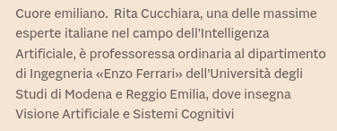 Problemi e speranze, l’intelligenza artificiale interpreta il mondo. Rita Cucchiara. Tra le massime esperte italiane del campo, alla Franceschetta di Bottura, spiega contraddizioni, paradossi e successi di un settore in Italia in mano alle donne, in una intervista a Paolo Bricco. Ho estrapolato dal testo riprodotto sopra i passi riguardanti l’argomento AI.