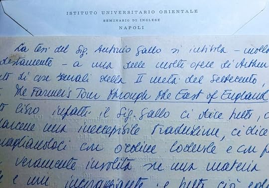 “La tesi del sig. Gallo si intitola molto modestamente ad una delle tante opere di Arthur Young esperto di cose rurali della seconda metà del ‘700, intitolata: “The Farmer’s Tour through the East of England”. Di questo libro, infatti, il sig. Gallo ci dice tutto oltre a farcene una ineccepibile traduzione; ci dice tutto ragguagliandoci con ordine lodevole e con penetrazione su una materia non facile e non incoraggiante e tutto ciò che egli ci dà in una forma cui nulla si dovrà aggiungere o togliere se si dovrà pensare alla pubblicazione. Questa parte del lavoro già di per sè meriterebbe il massimo apprezzamento e la migliore considerazione.