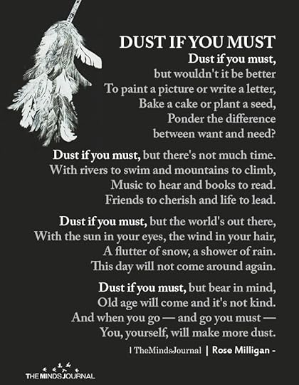 Spolvera se proprio lo devi fare, ma non c’è molto tempo, ci sono fiumi da nuotare, montagne da scalare, musica da ascoltare, libri da leggere, amici da godere, una vita da vivere.